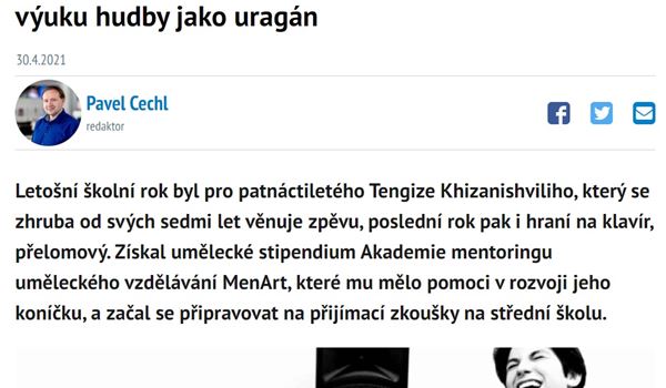 Letošní školní rok byl pro patnáctiletého Tengize Khizanishviliho, který se zhruba od svých sedmi let věnuje zpěvu, poslední rok pak i hraní na klavír, přelomový. Získal umělecké stipendium Akademie mentoringu uměleckého vzdělávání MenArt, které mu mělo pomoci v rozvoji jeho koníčku, a začal se připravovat na přijímací zkoušky na střední školu.